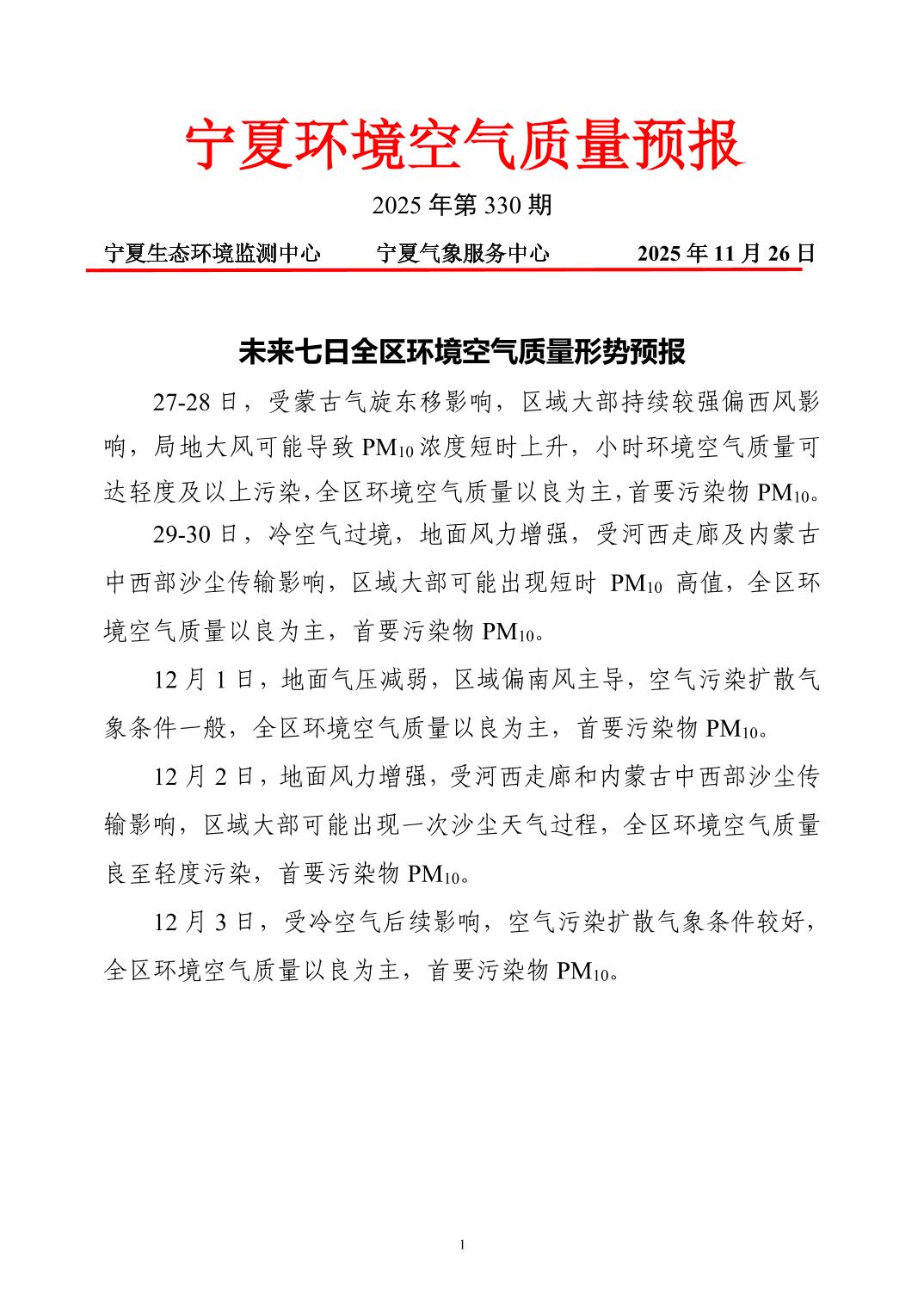 2025年11月26日宁夏环境空气质量预报信息