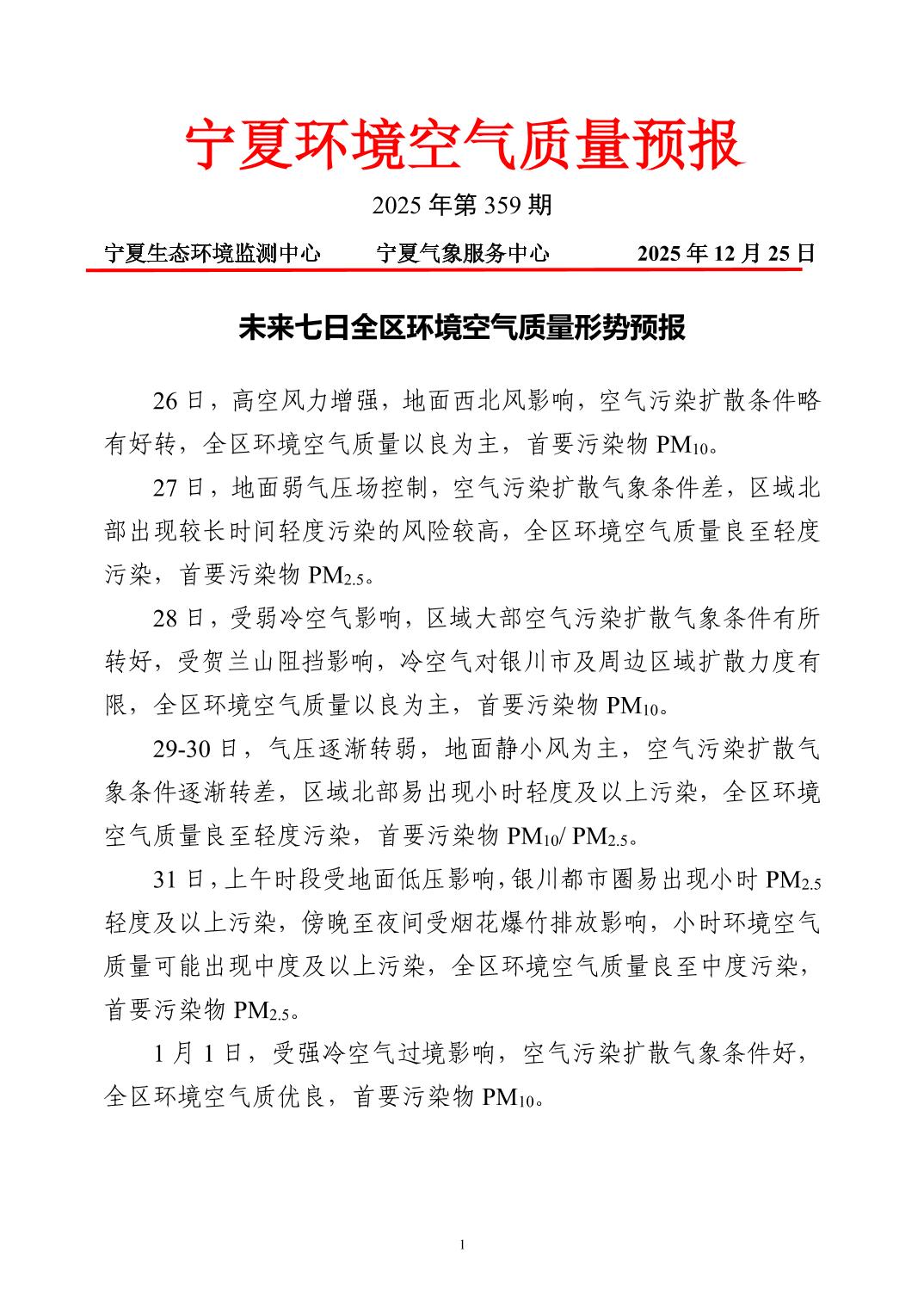 2025年12月25日宁夏环境空气质量预报信息