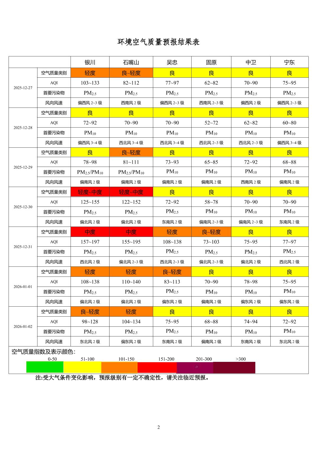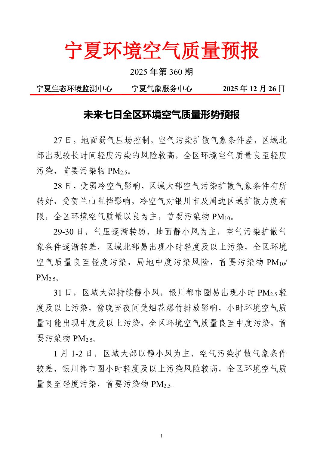 2025年12月26日宁夏环境空气质量预报信息