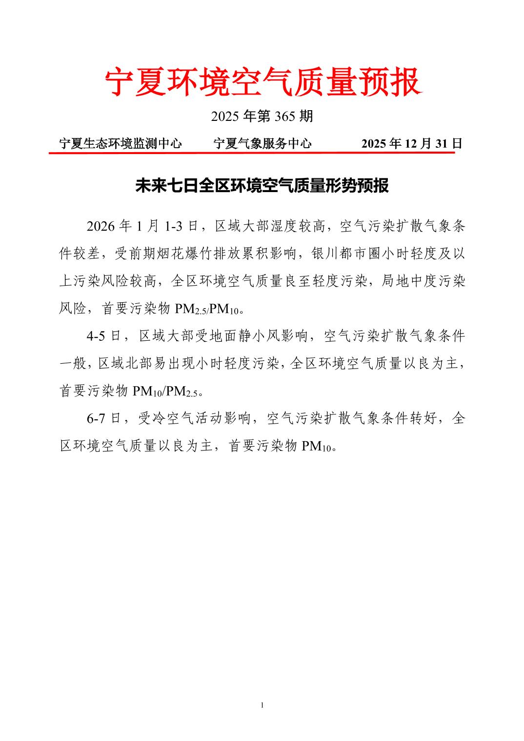 2025年12月31日宁夏环境空气质量预报信息