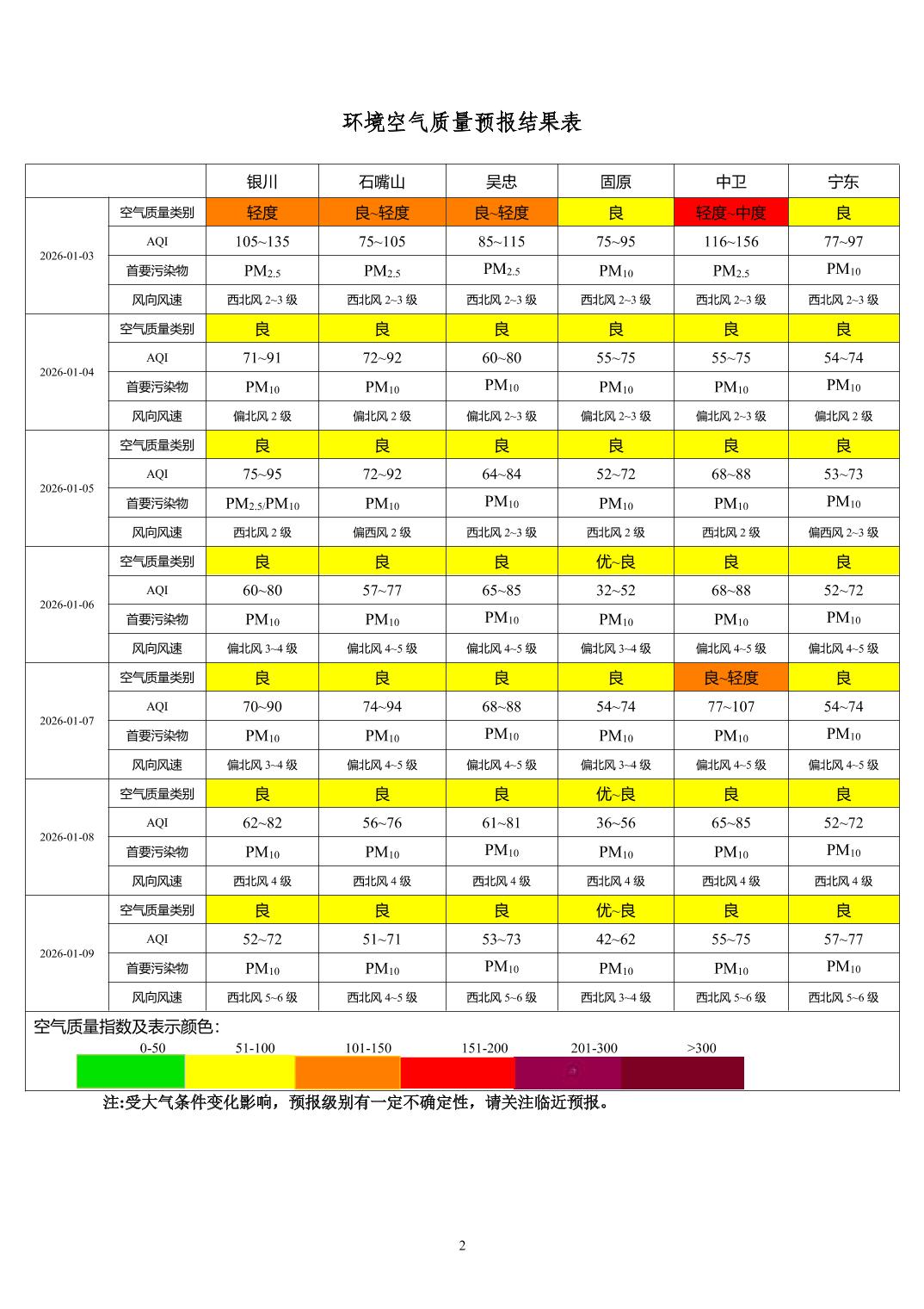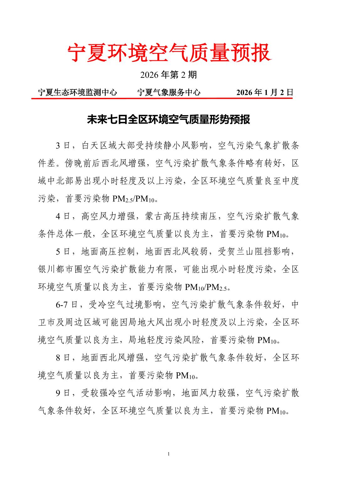 2026年1月2日宁夏环境空气质量预报信息