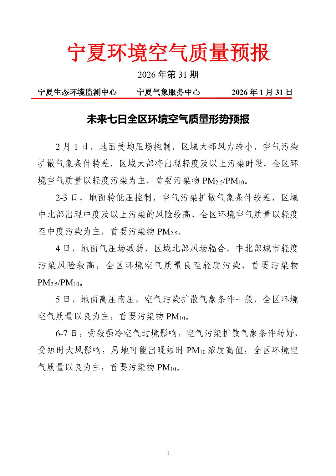 2026年1月31日宁夏环境空气质量预报信息