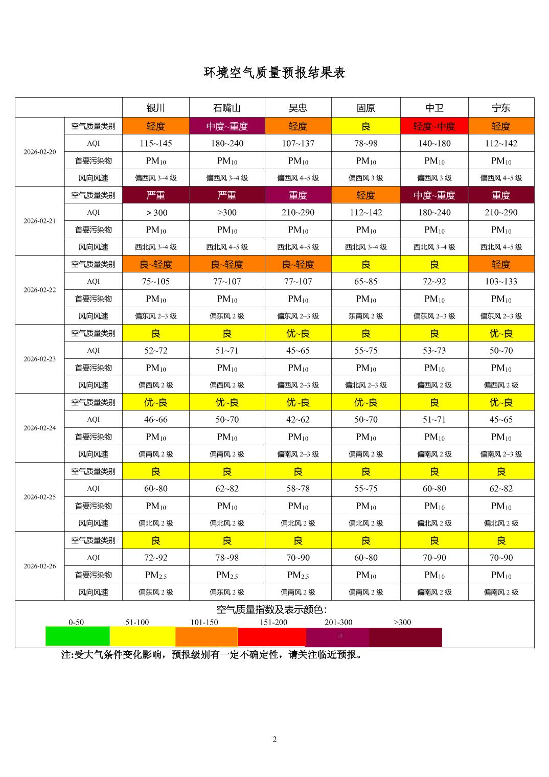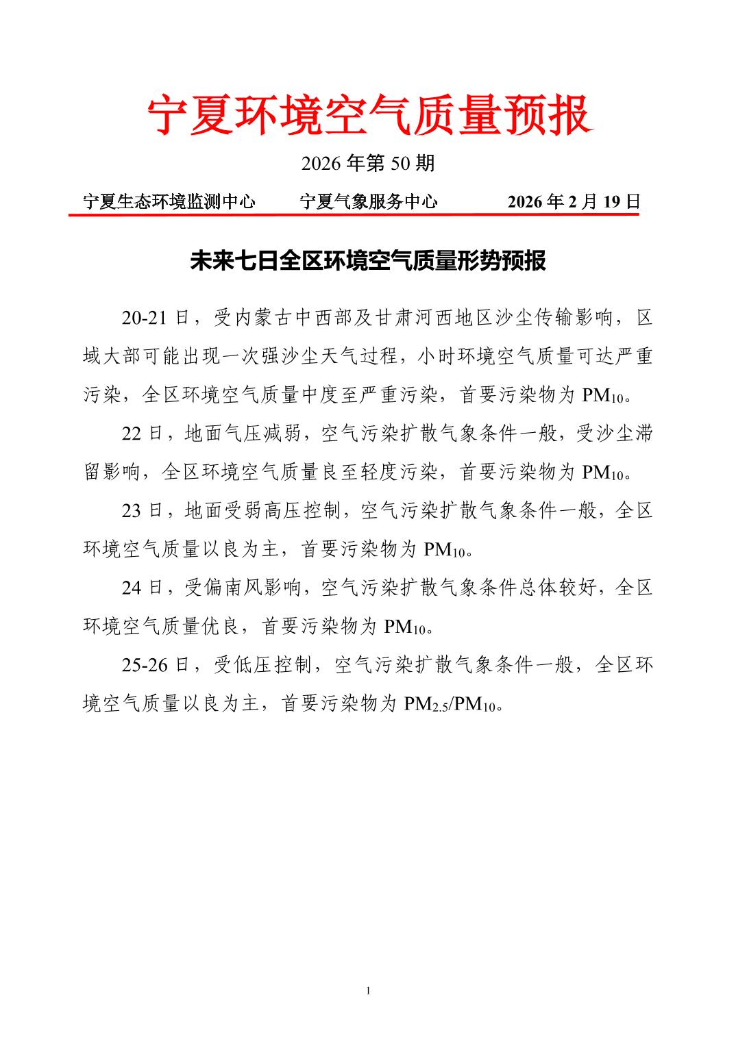 2026年2月19日宁夏环境空气质量预报信息