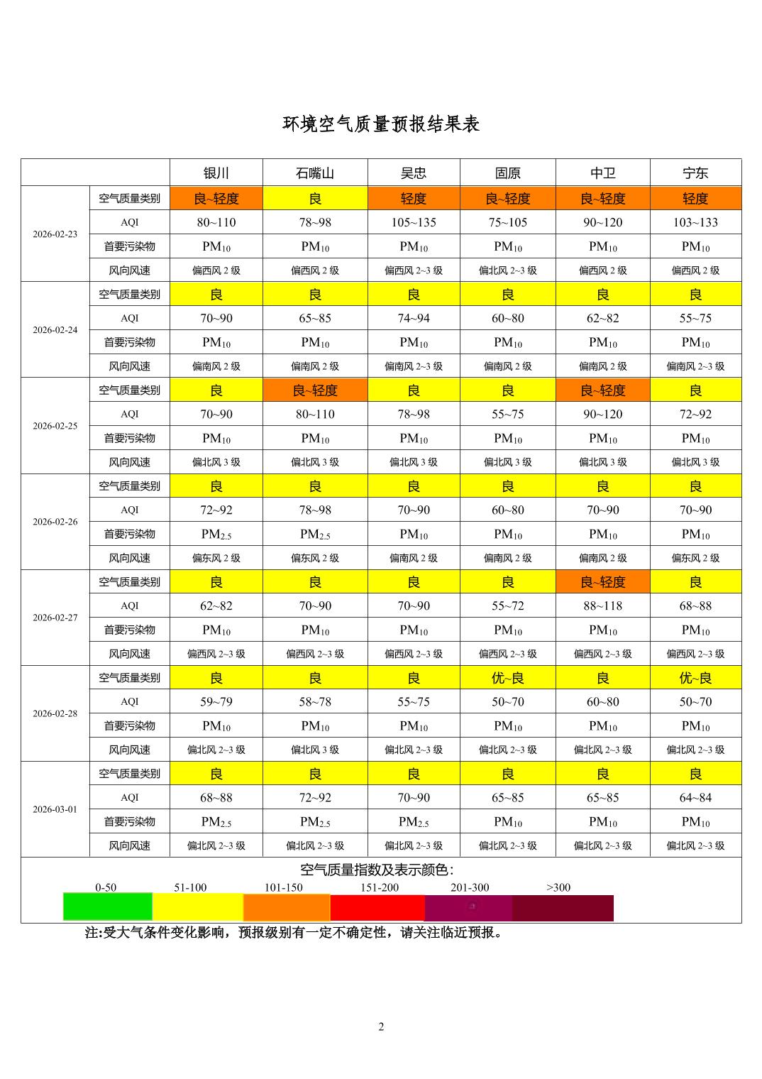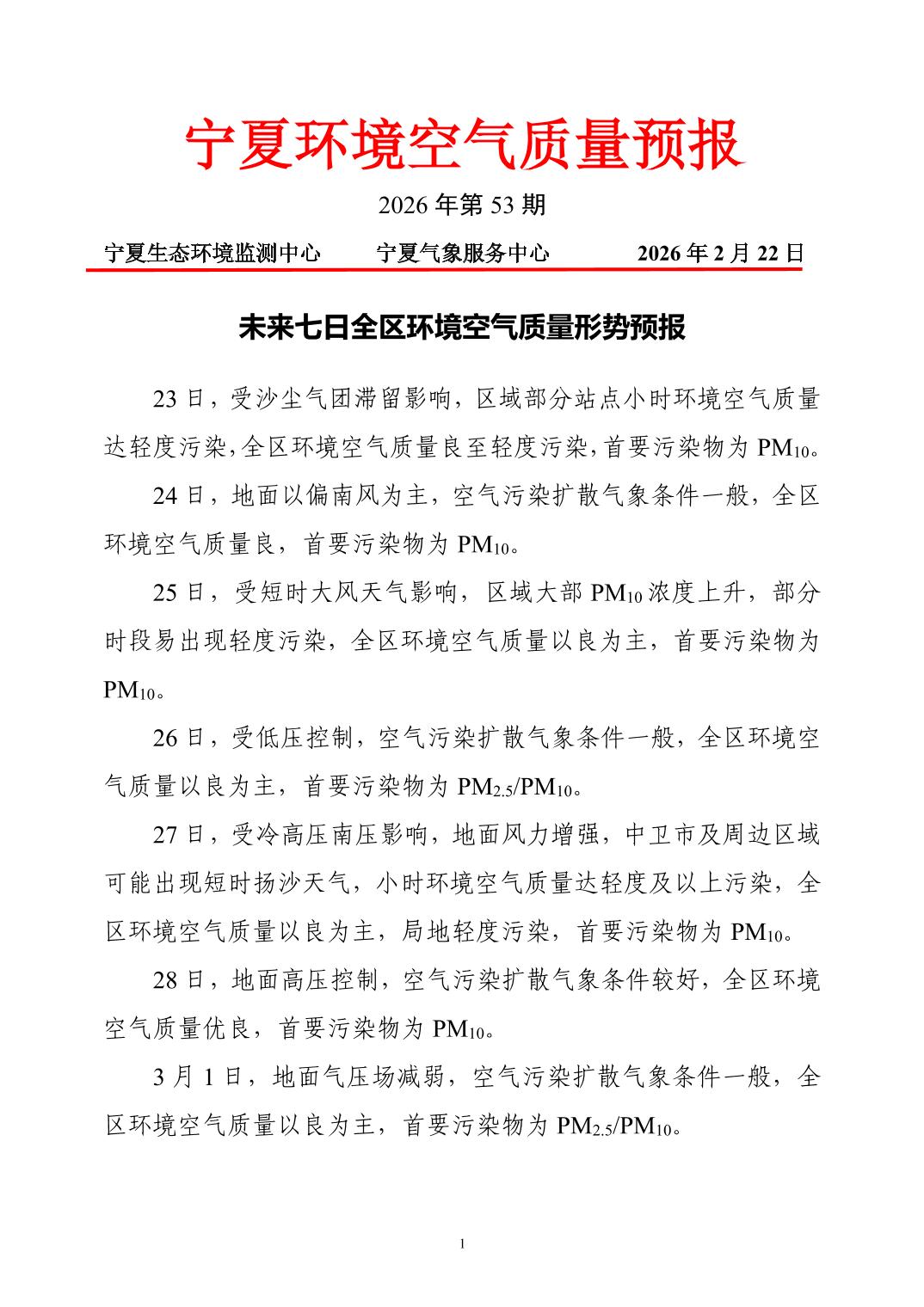 2026年2月22日宁夏环境空气质量预报信息