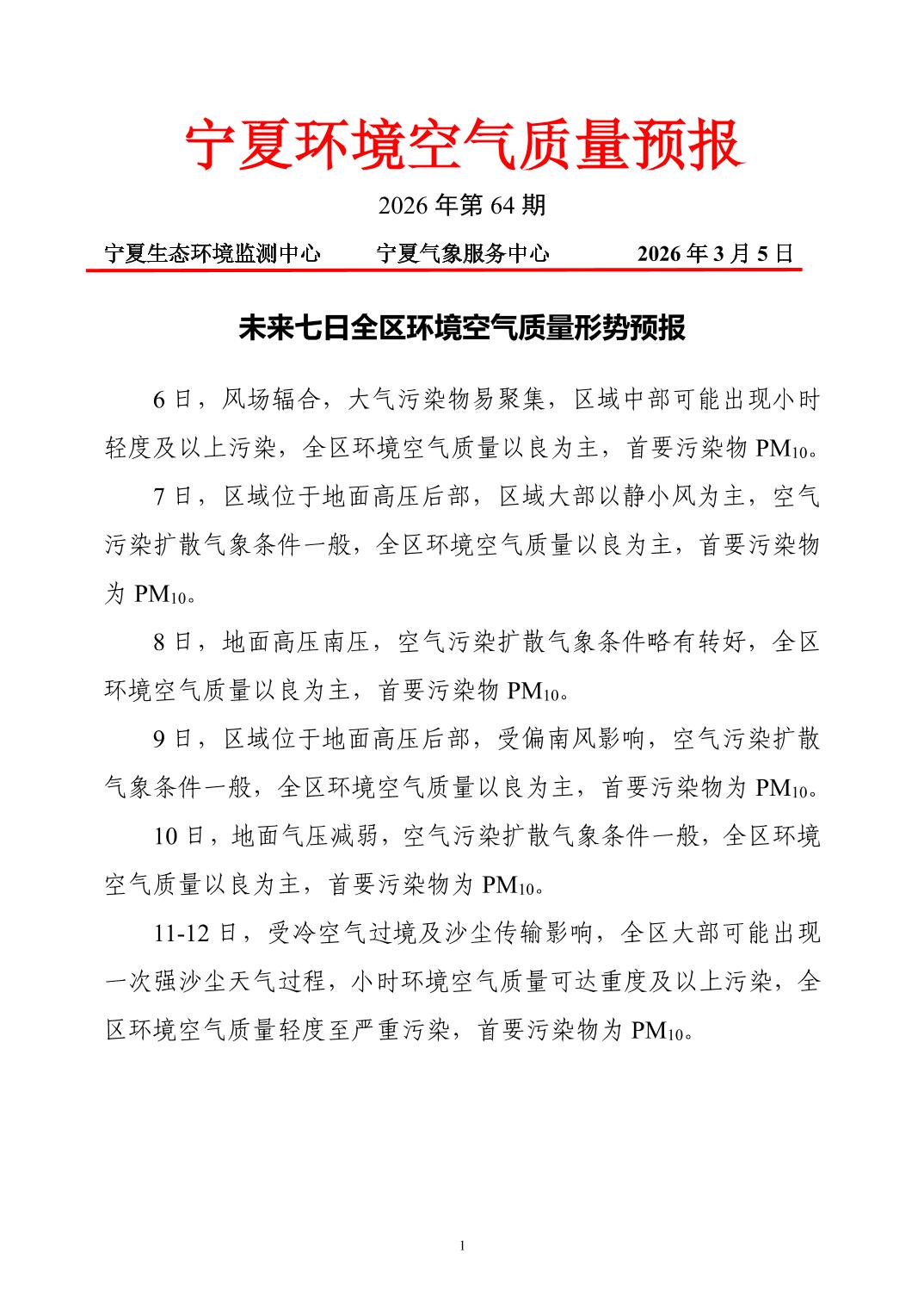 2026年3月5日宁夏环境空气质量预报信息