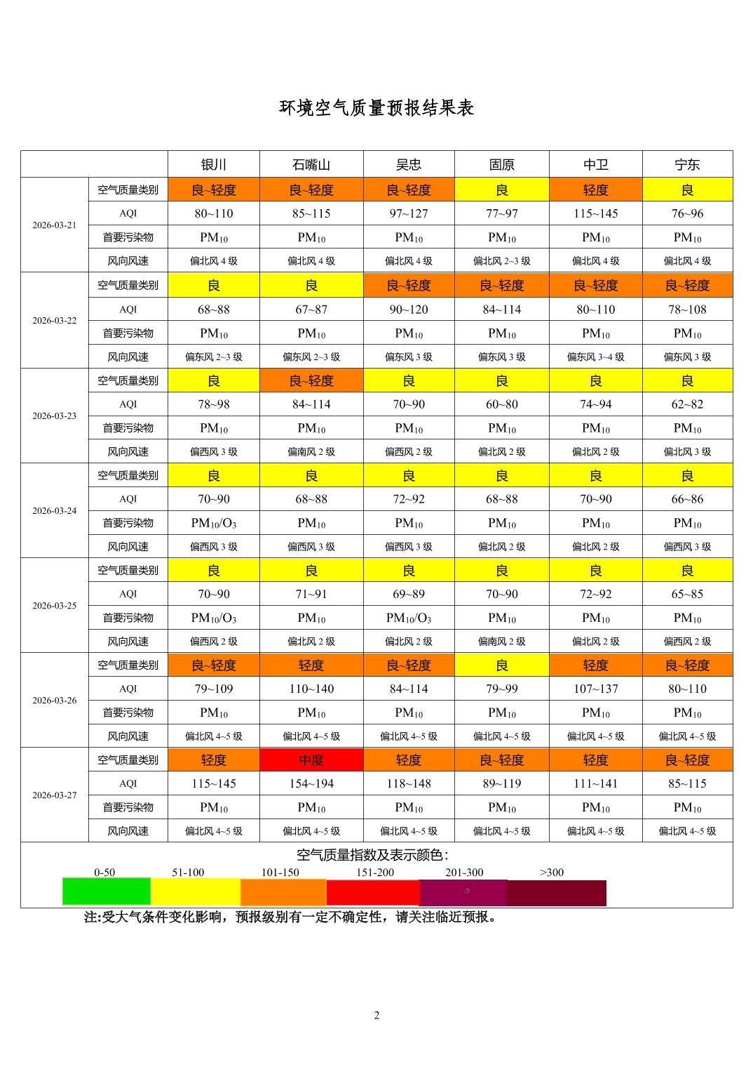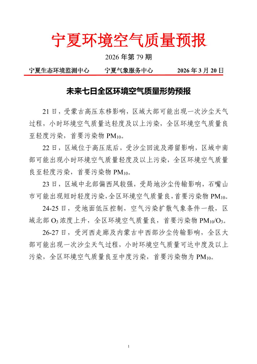 2026年3月20日宁夏环境空气质量预报信息