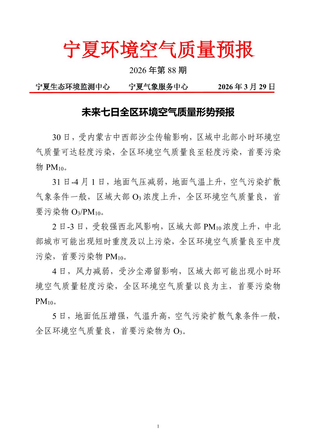 2026年3月29日宁夏环境空气质量预报信息