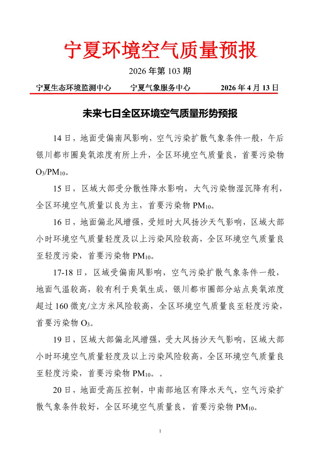 2026年4月13日宁夏环境空气质量预报信息