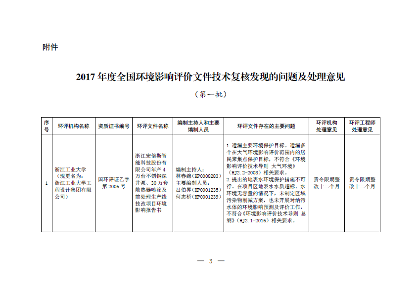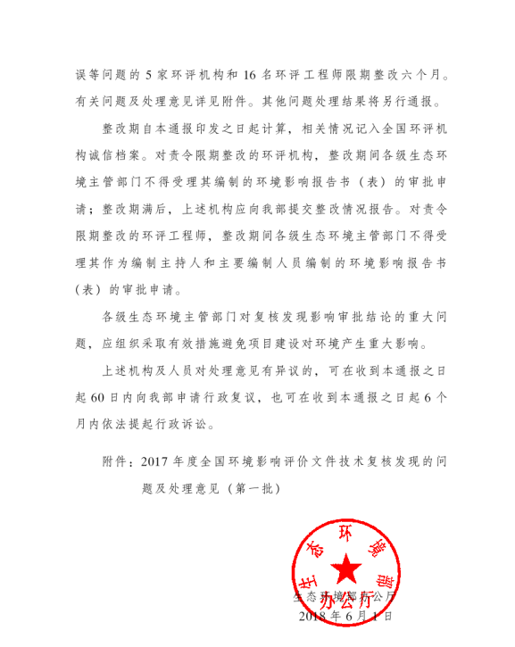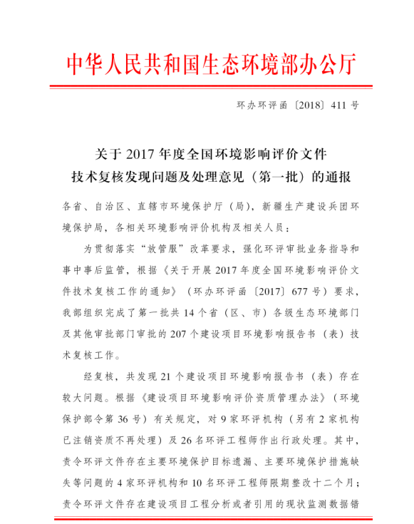 生态环境部办公厅关于2017年度全国环境影响评价文件技术复核发现问题及处理意见(第一批)的通报