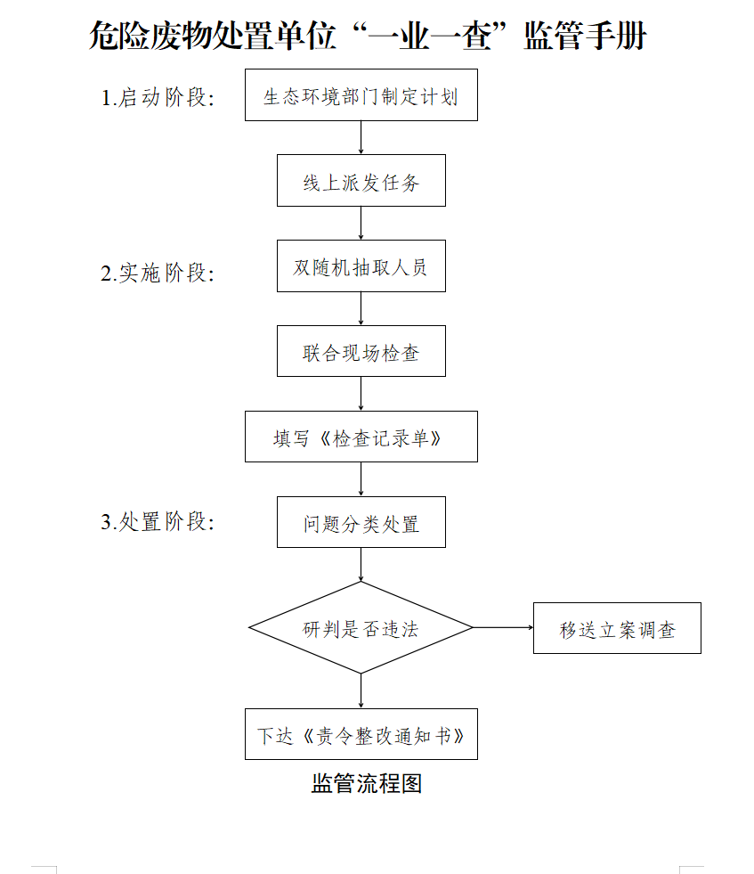 (3)处置阶段:联合检查组在检查过程中发现的问题,应当及时指导危险废物处置单位采取有效的处理措施,并按照“谁监管、谁负责”的原则,由相关监管部门实施后续监管及处置工作。