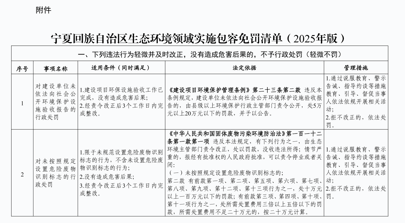 关于印发《宁夏回族自治区生态环境领域实施包容免罚清单(2025年版)》的通知