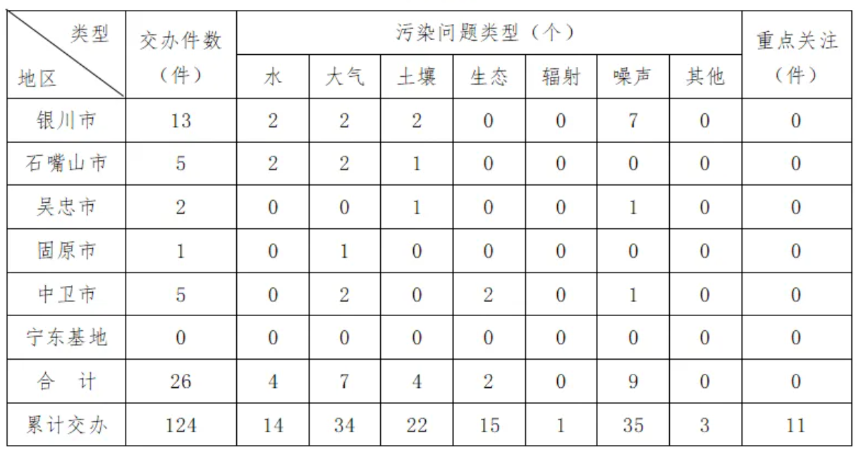 截至6月4日,中央第五生态环境保护督察组累计向宁夏回族自治区转办信访举报件共124件,涉及水污染问题14个、大气污染问题34个、土壤污染问题22个、生态破坏问题15个、辐射污染问题1个、噪声污染问题35个、其他污染问题3个。