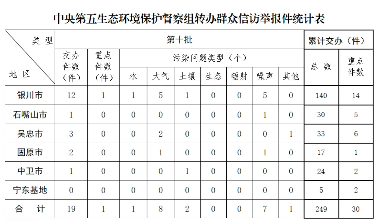 6月8日,中央第五生态环境保护督察组向宁夏回族自治区转办第十批信访举报件共19件(重点关注件1件),其中来电18件、来信1件。本批次信访举报件涉及银川市12件、石嘴山市1件、吴忠市3件、固原市2件、中卫市1件。上述信访举报件已全部及时交办调查处理。