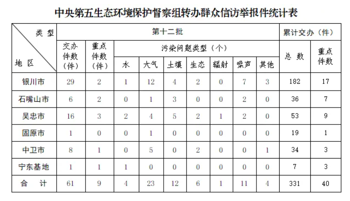 6月10日,中央第五生态环境保护督察组向宁夏回族自治区转办第十二批信访举报件共61件(重点关注件9件),其中来电55件、来信6件。本批次信访举报件涉及银川市29件、石嘴山市6件、吴忠市16件、固原市1件、中卫市8件、宁东基地1件。上述信访举报件已全部及时交办调查处理。