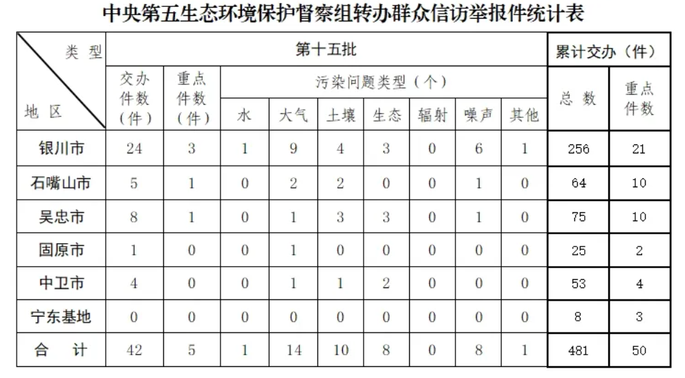 截至6月13日,中央第五生态环境保护督察组累计向宁夏回族自治区转办信访举报件共481件,涉及水污染问题39个、大气污染问题158个、土壤污染问题85个、生态破坏问题54个、辐射污染问题2个、噪声污染问题120个、其他污染问题23个。