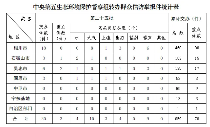 6月23日,中央第五生态环境保护督察组向宁夏回族自治区转办第二十五批信访举报件共30件(重点关注件3件),其中来电29件、来信1件。本批次信访举报件涉及银川市18件、石嘴山市3件、吴忠市6件、固原市3件。上述信访举报件已全部及时交办调查处理。