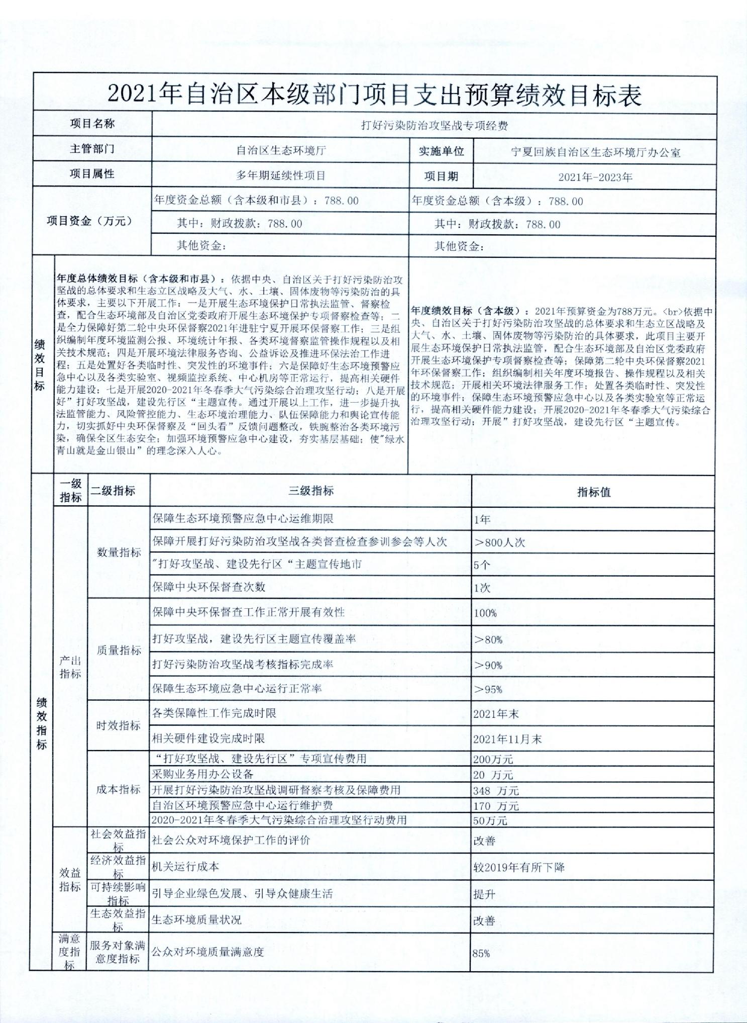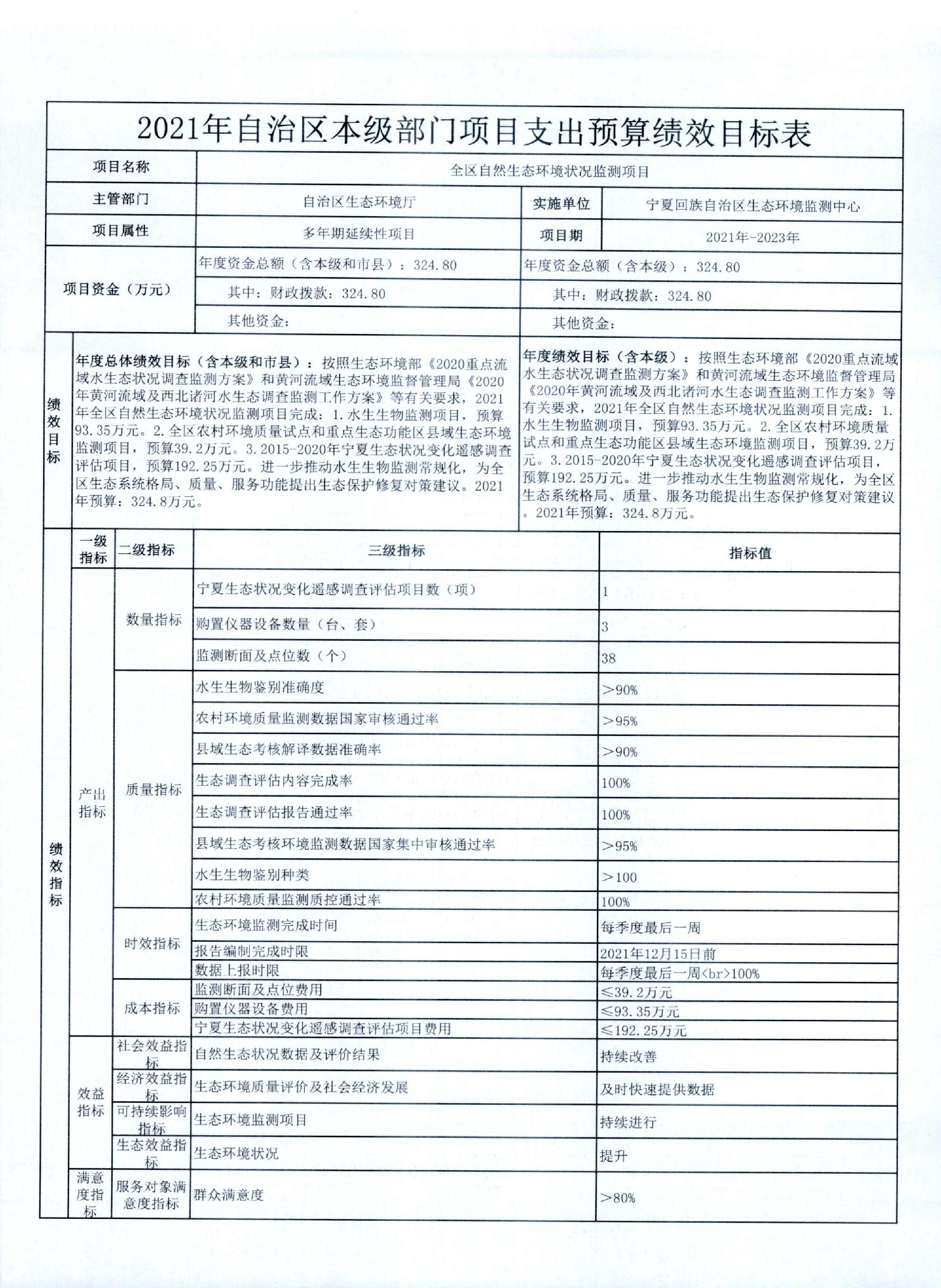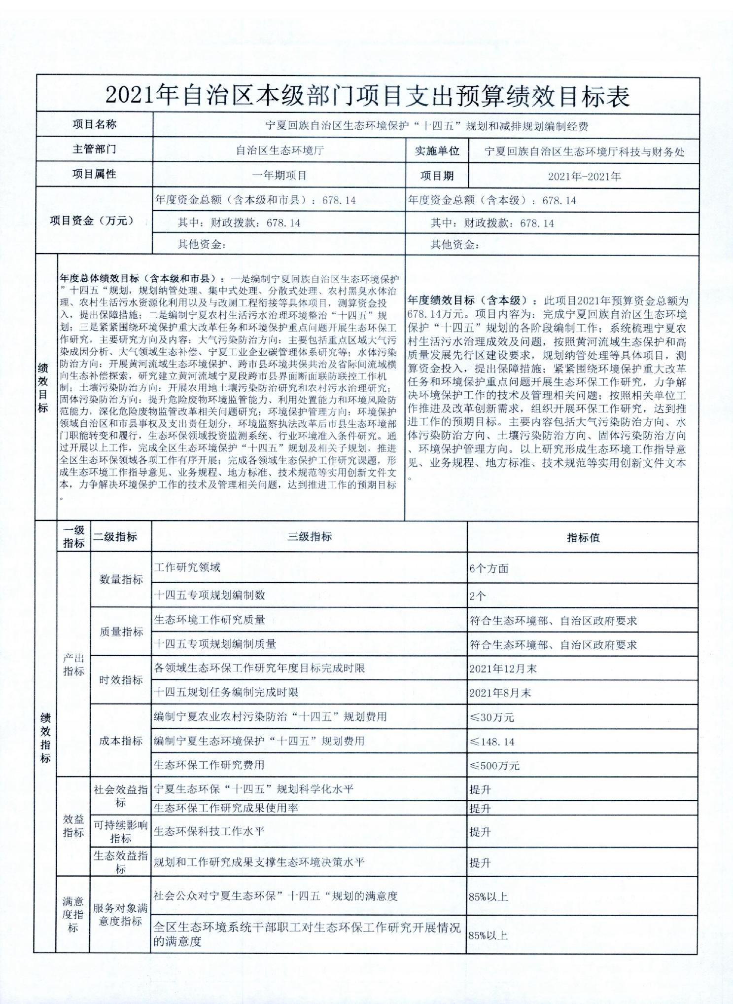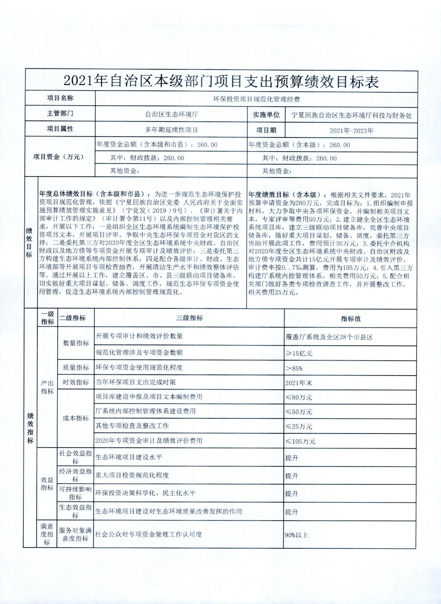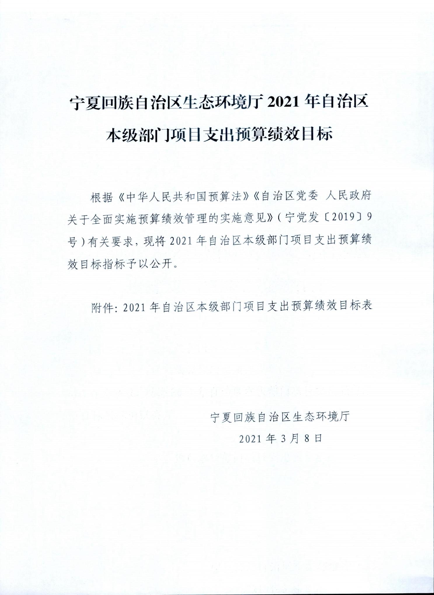 宁夏回族自治区生态环境厅2021年自治区本级部门项目支出预算绩效目标
