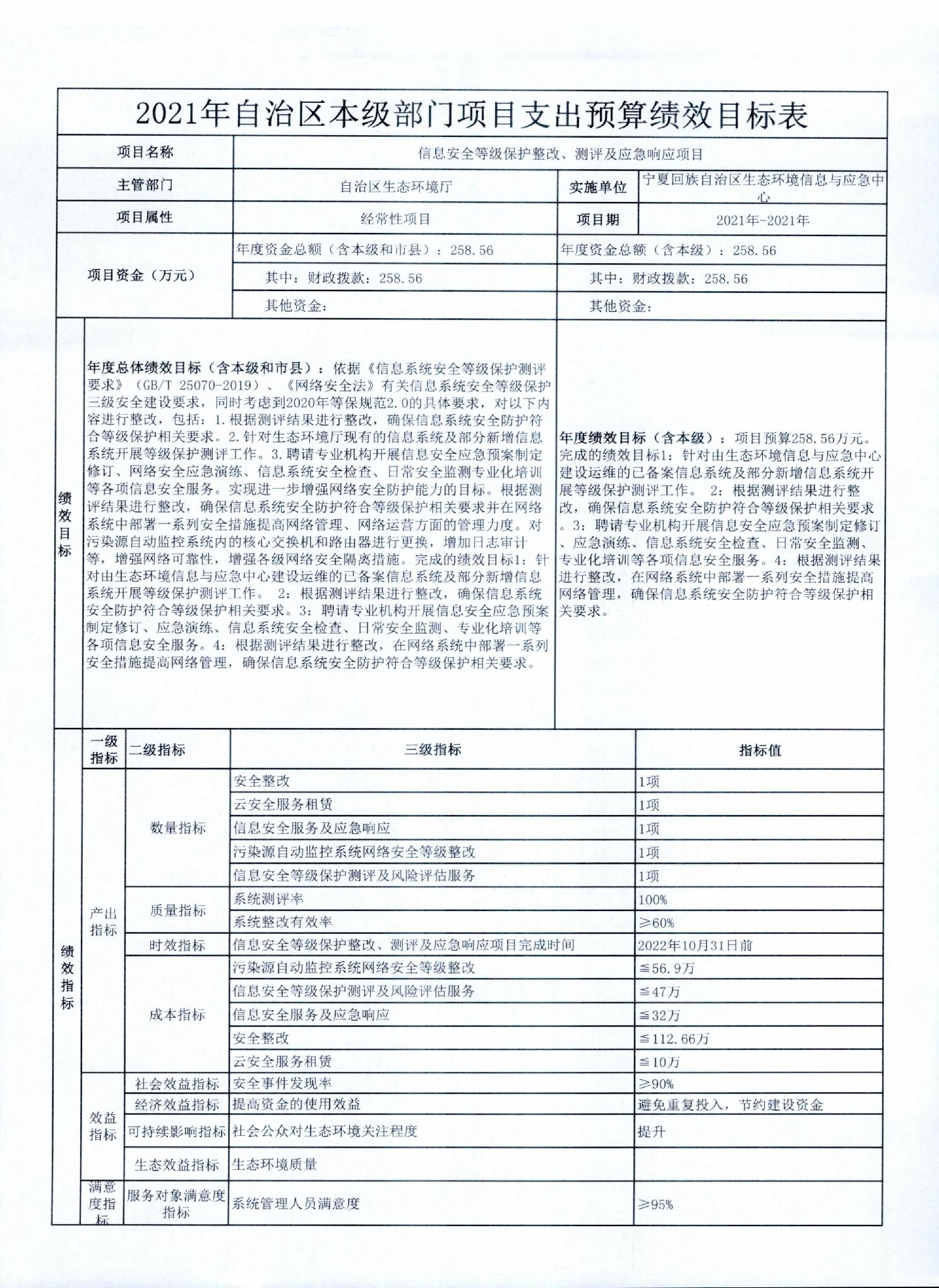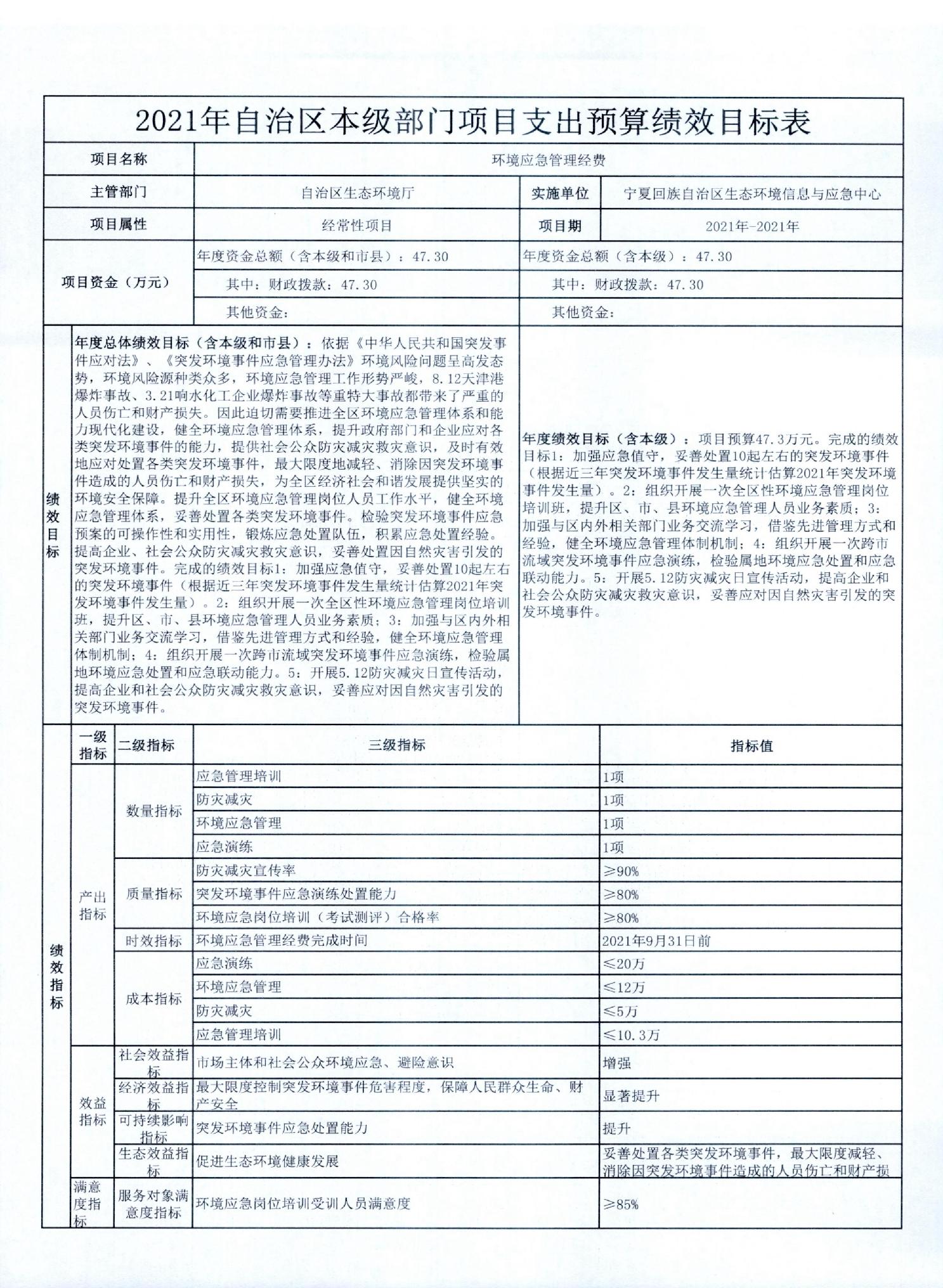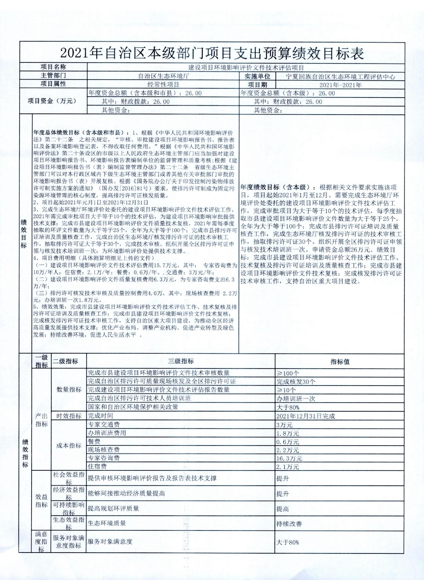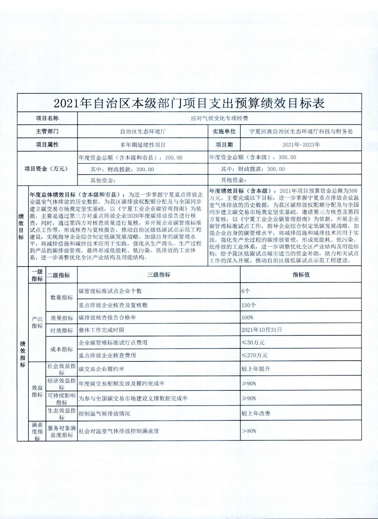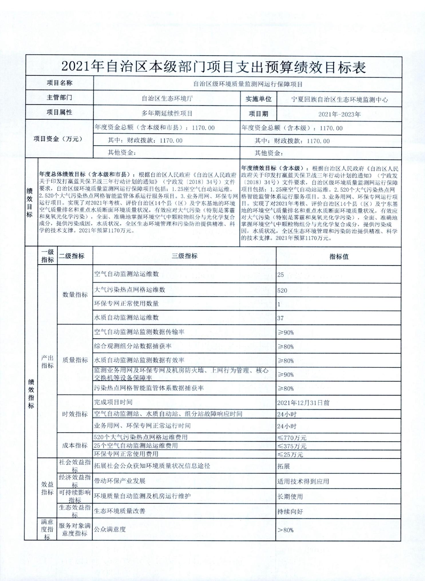 宁夏回族自治区生态环境厅2021年自治区本级部门项目支出预算绩效目标