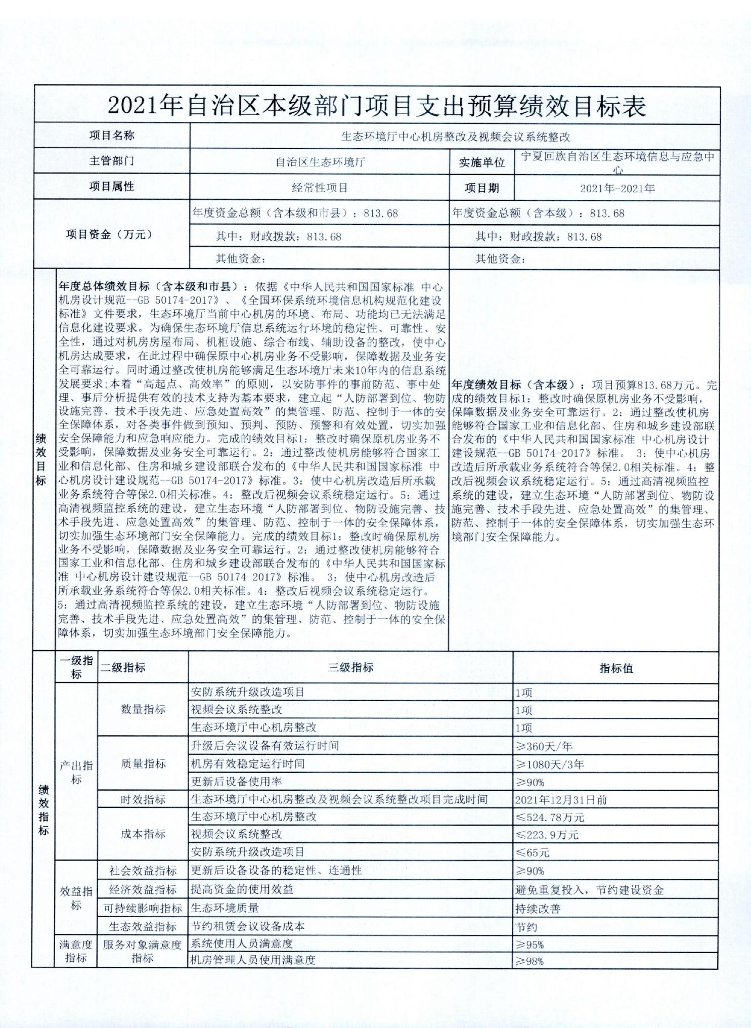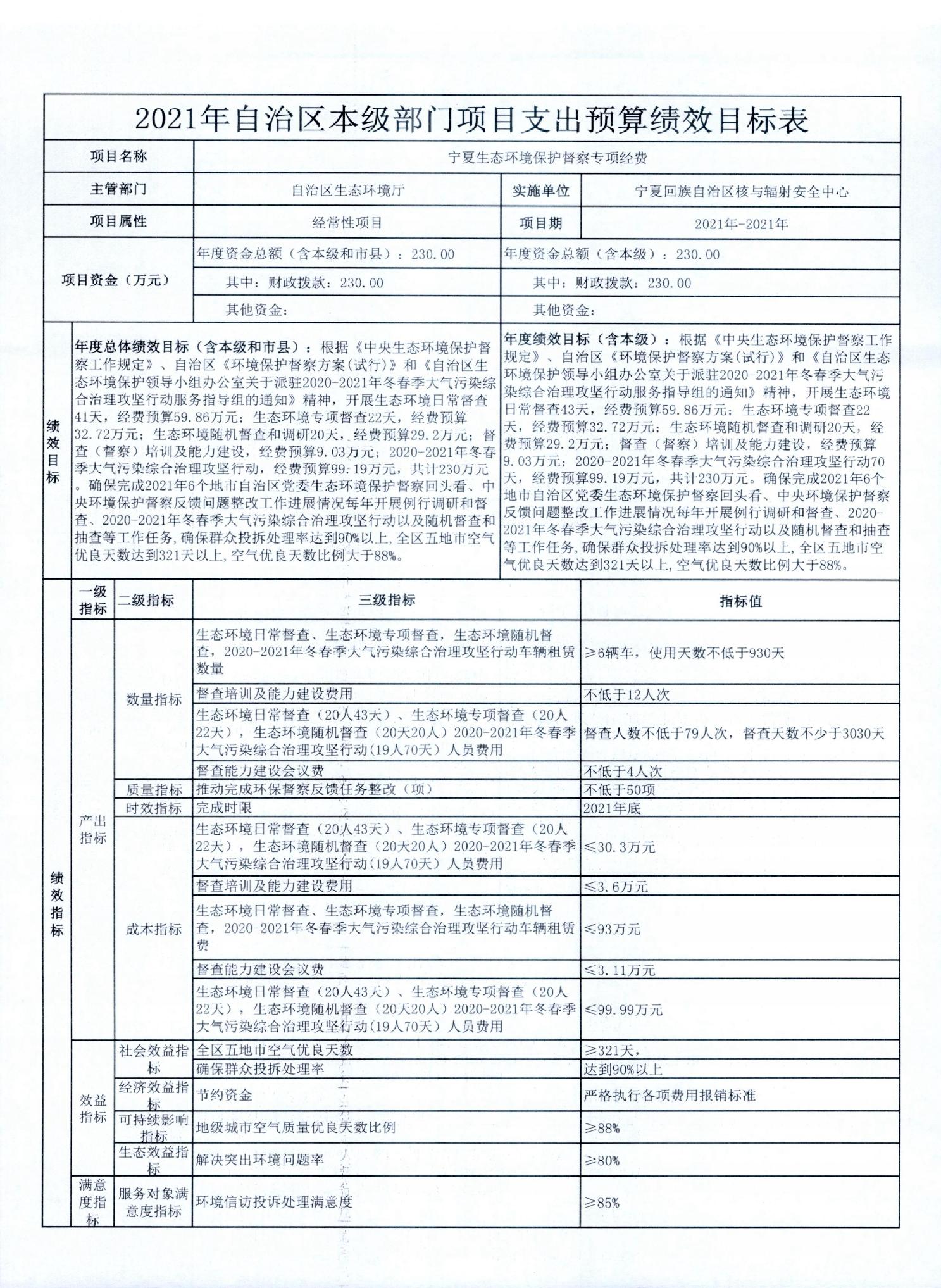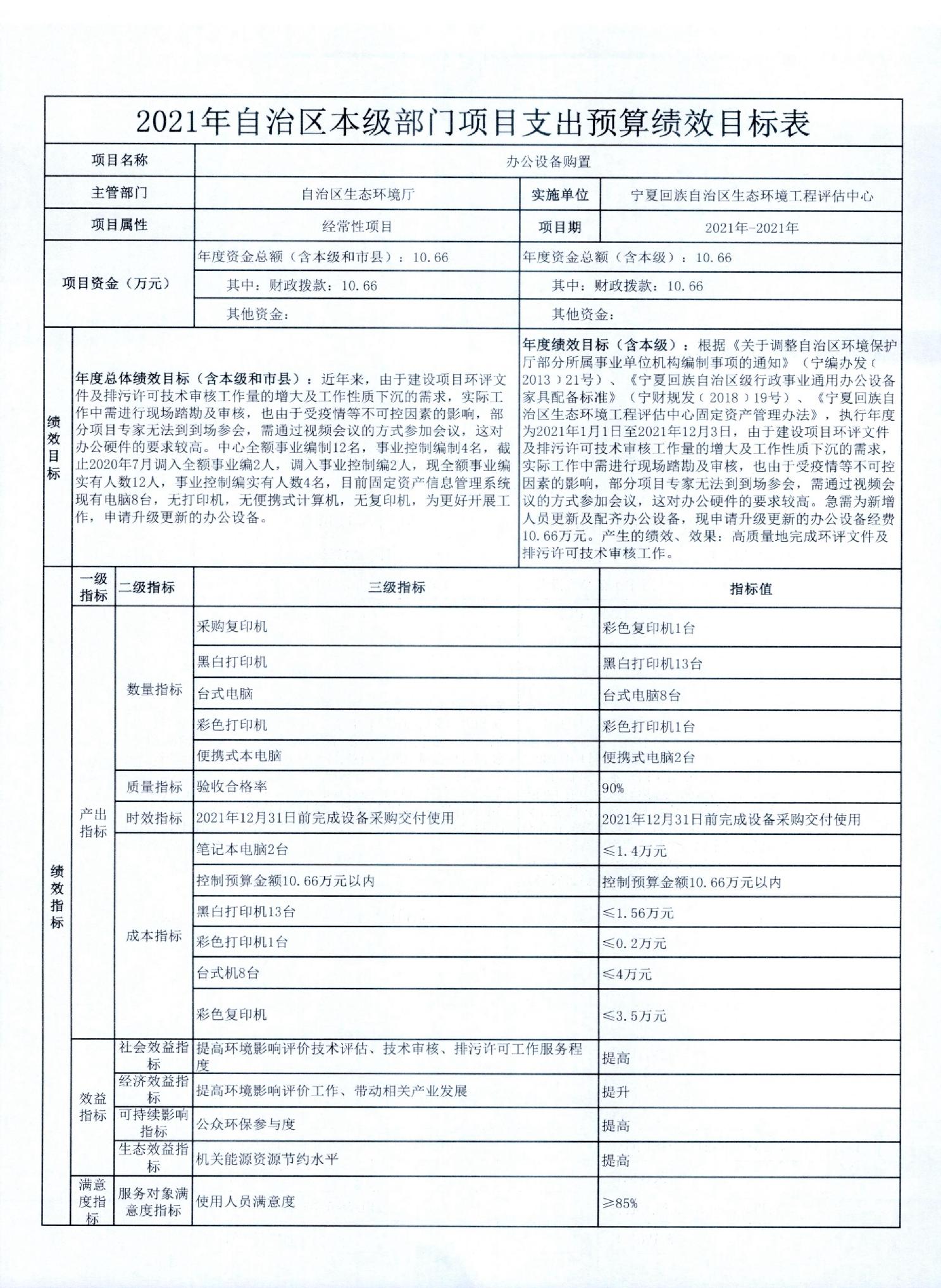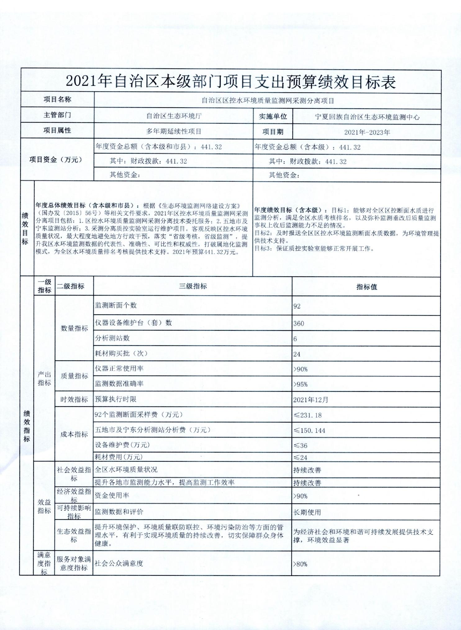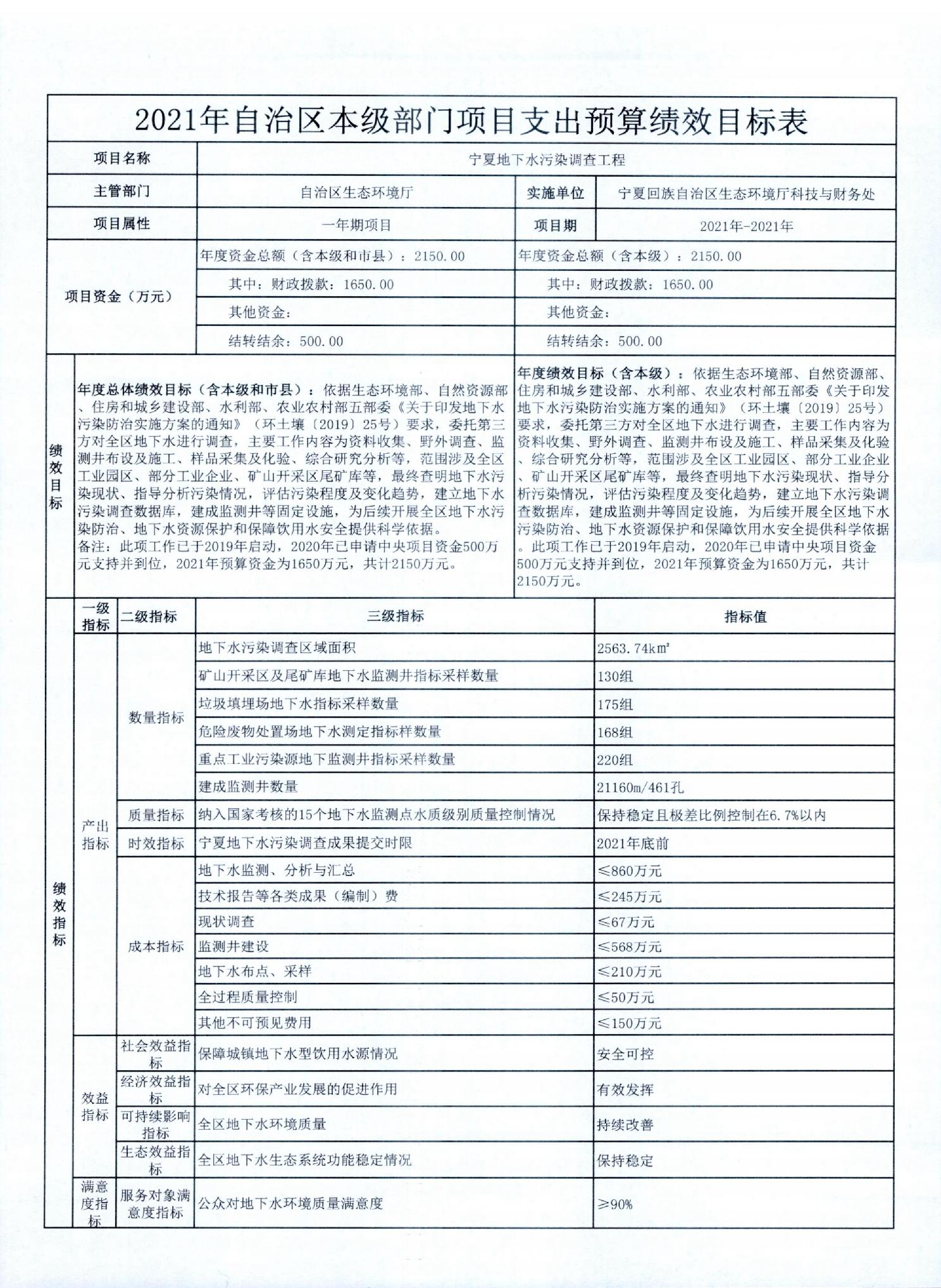 宁夏回族自治区生态环境厅2021年自治区本级部门项目支出预算绩效目标