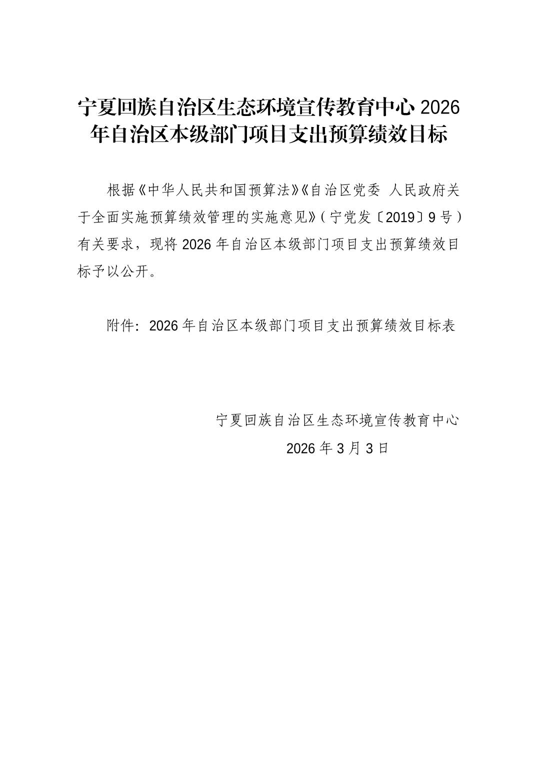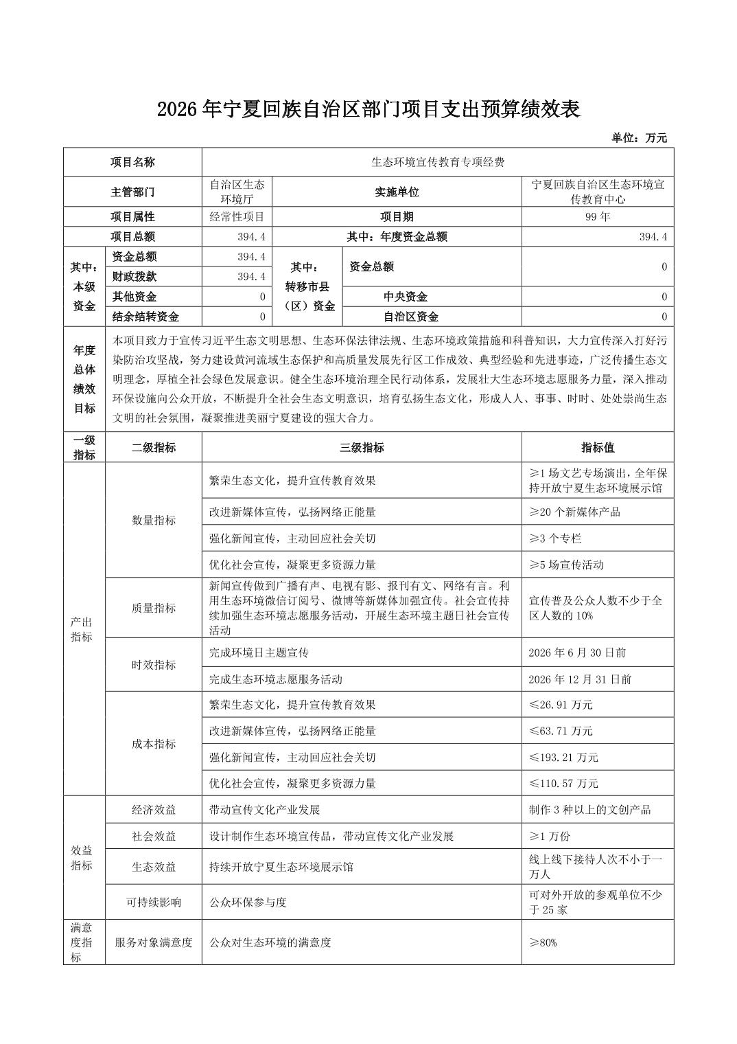 宁夏回族自治区生态环境宣传教育中心2026年自治区本级部门项目支出预算绩效目标