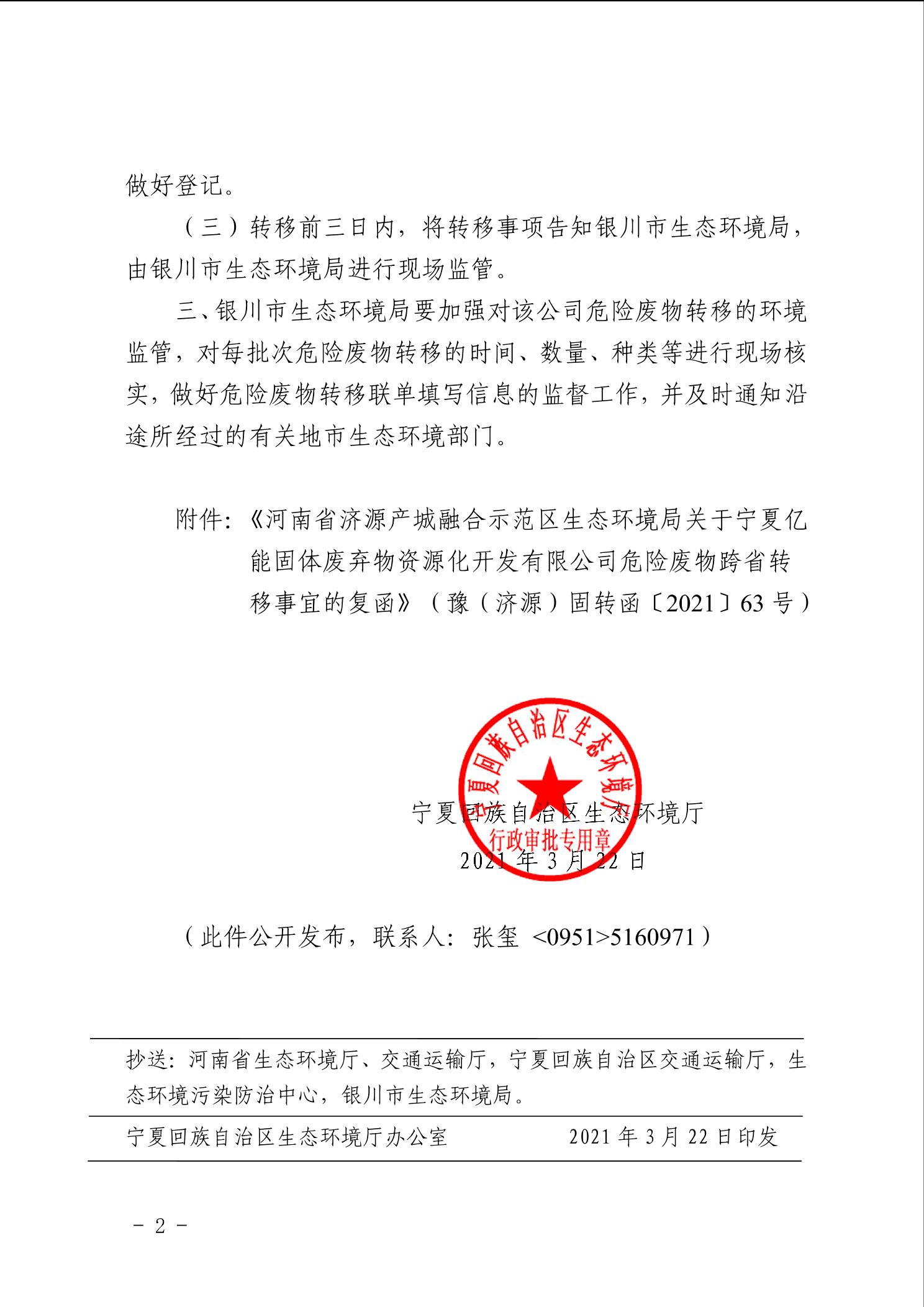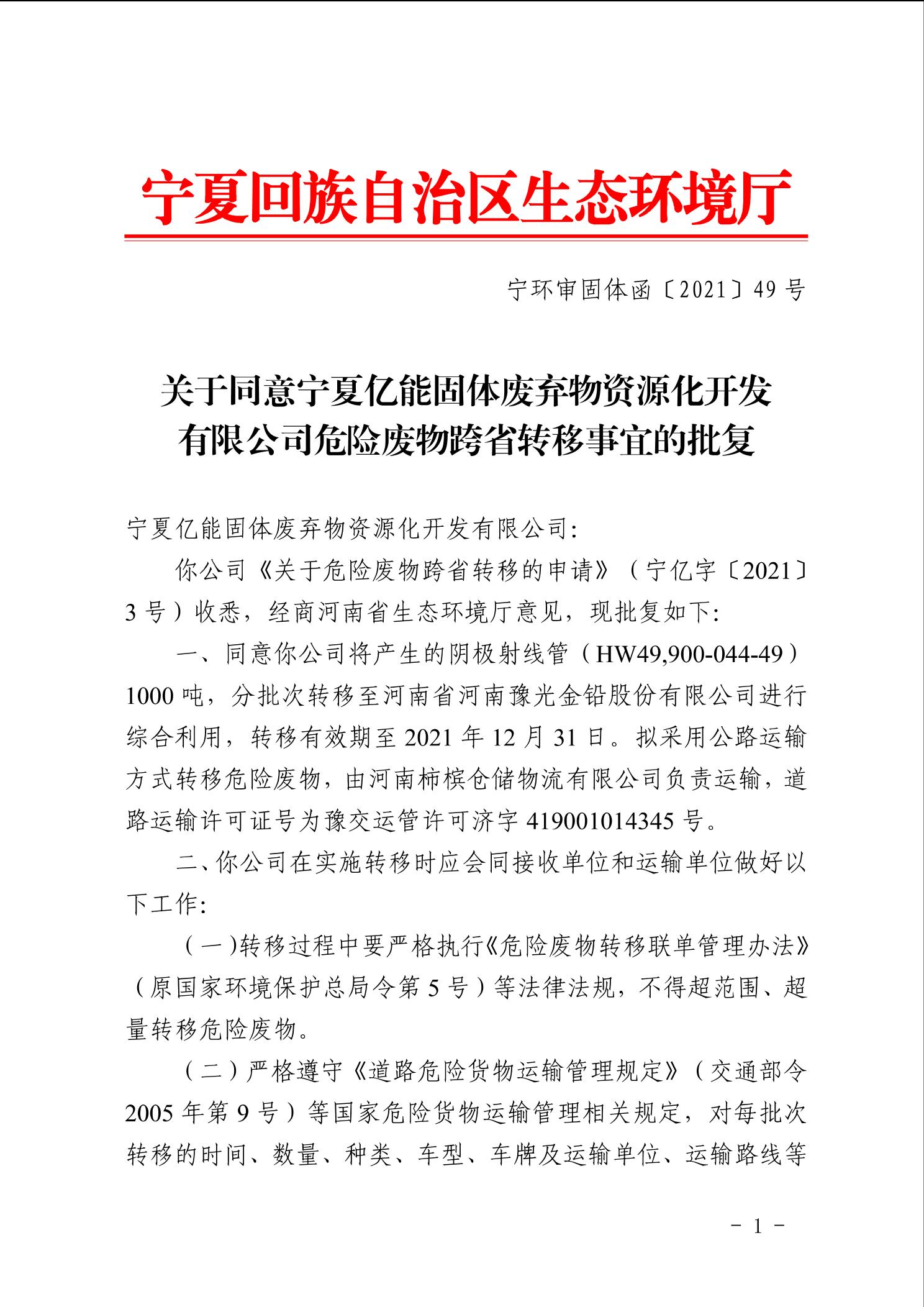 关于同意宁夏亿能固体废弃物资源化开发有限公司危险废物跨省转移事宜的批复(000014210107005)宁环审固体函〔2021〕49号