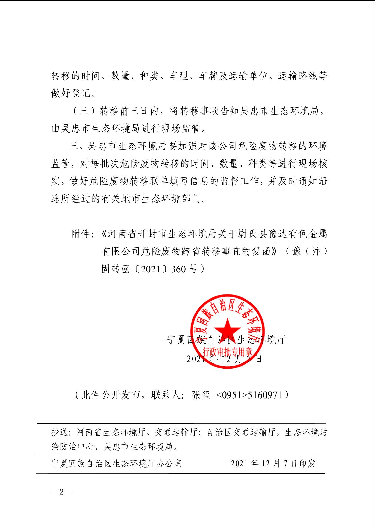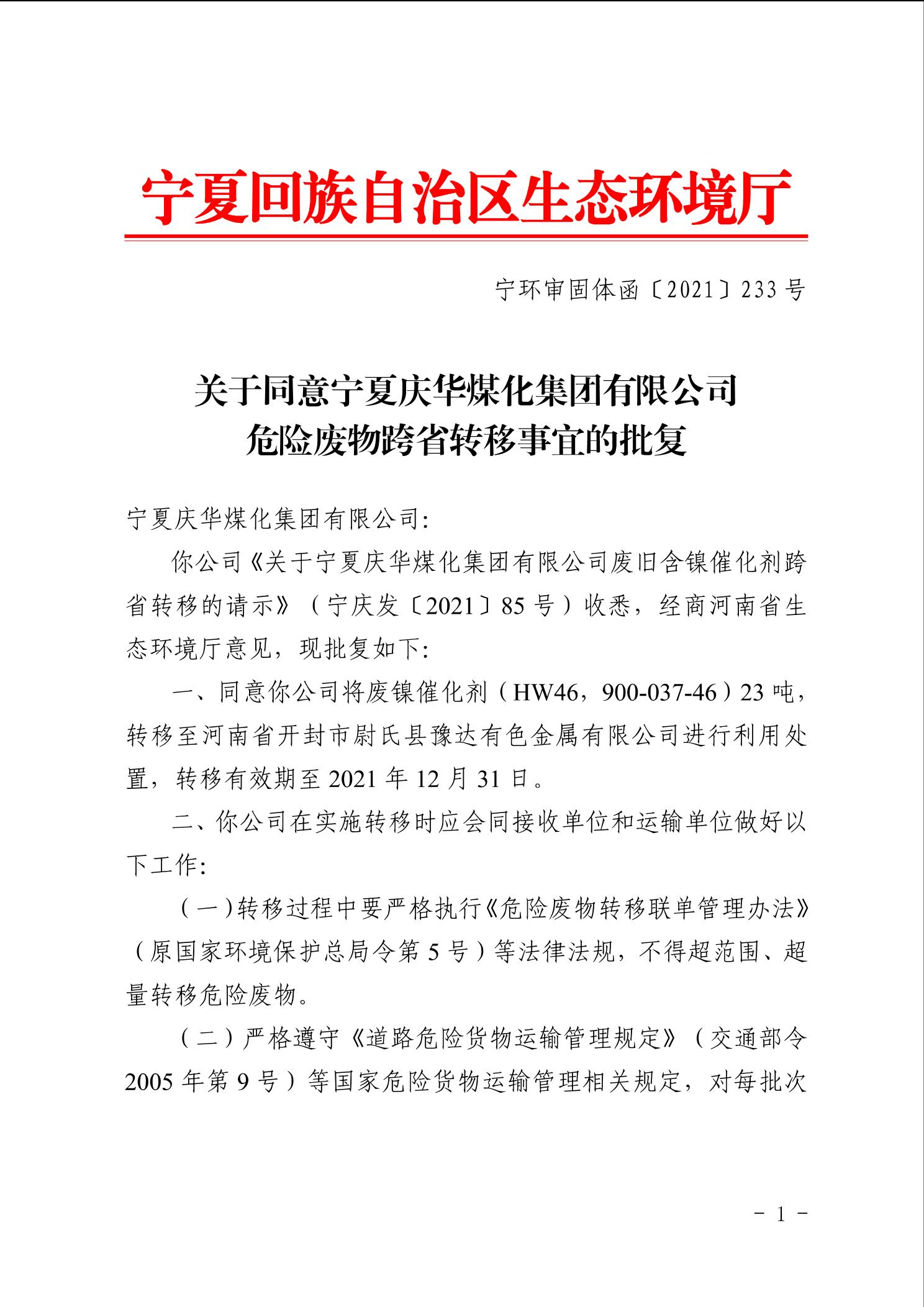 关于同意宁夏庆华煤化集团有限公司危险废物跨省转移事宜的批复