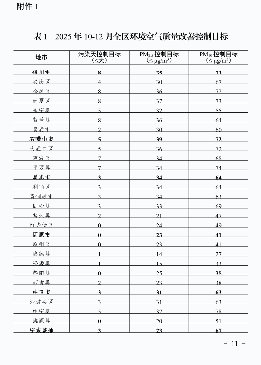 第一阶段(2025年10-12月):全区地级城市空气质量污染天数平均控制在4天以内;扣除沙尘天气影响,PM2.5、PM10平均浓度分别控制在33微克/立方米和63微克/立方米。各市、县(区)和宁东基地确保第4季度空气质量同比改善,力争完成10-12月控制目标和2025年度空气质量改善目标和重点治理任务。(见附表1)