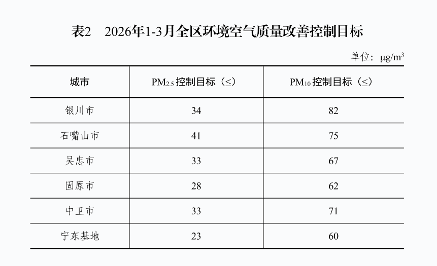 第二阶段(2026年1-3月):2026年3月底,各市、县(区)和宁东基地完成 2026年1-3月环境空气质量改善建议控制目标,为完成2026年和“十五五”环境空气质量目标打好基础。(见附表2)