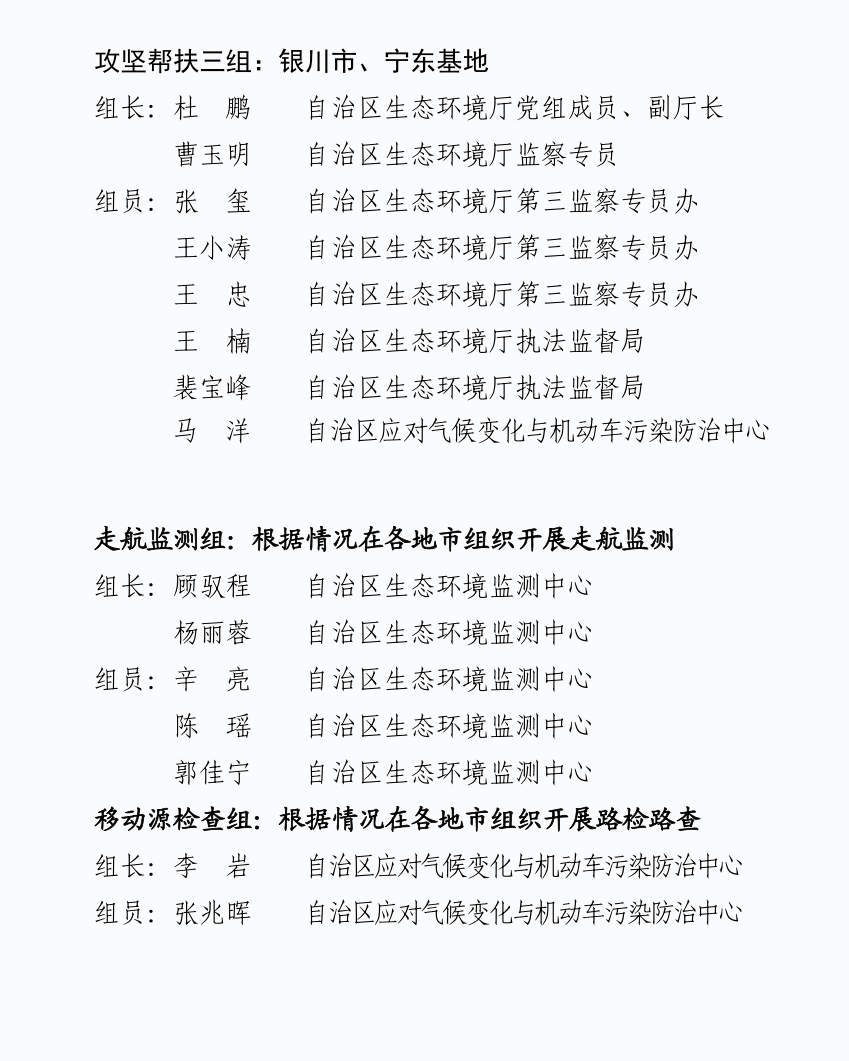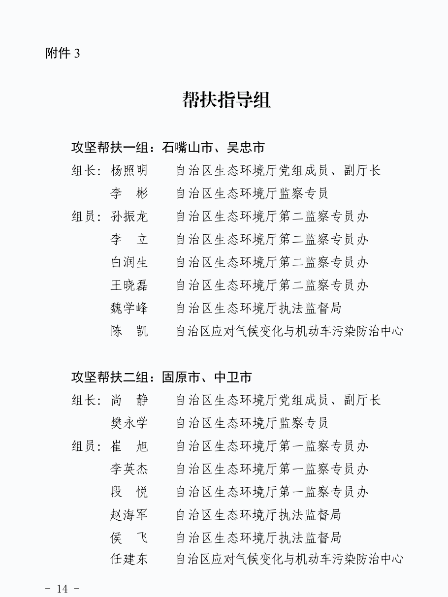 21.加大帮扶指导。自治区抽调精干力量组成攻坚服务指导组(各组配专家2人),11-12月全天候下沉各地开展现场指导(攻坚期其他时间段根据工作需要),逐级压实工作责任。组建专家技术帮扶团队,为各地提供大气污染分析研判和防控指导,提高攻坚期间大气精细化管控水平。(责任单位:自治区生态环境厅负责)