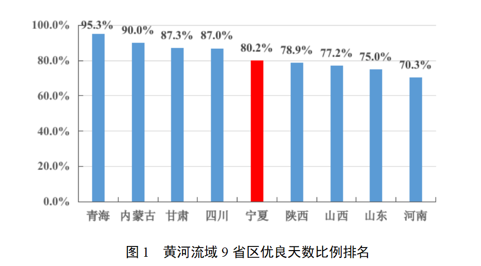 黄河流域9省区优良天数比例由高到低排名依次为:青海、内蒙古、甘肃、四川、宁夏、陕西、山西、山东和河南,宁夏排在第5位。