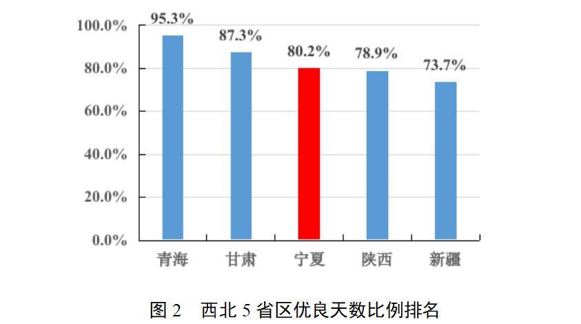 西北5省区优良天数比例由高到低排名依次为:青海、甘肃、宁夏、陕西和新疆,宁夏排在第3位。