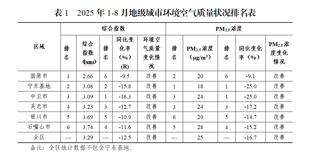 根据国家《地级及以上城市环境空气质量排名方案》(环办监测函〔2024〕9号)《地级及以上城市国家地表水考核断面水环境质量排名方案》(环办监测函〔2024〕61号)及《关于印发<宁夏回族自治区城市环境空气质量排名方案>和<宁夏回族自治区地表水考核断面水环境质量排名方案>的通知》(宁环办发〔2024〕21号)有关规定和要求,对2025年1-8月全区城市环境质量状况进行排名,排名结果如下: