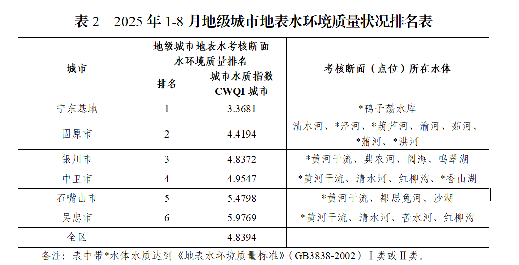 (一)地级城市地表水考核断面水环境质量状况排名。2025年1-8月,按城市水质指数排名,五地市及宁东基地地表水环境质量由好到差依次为:宁东基地、固原市、银川市、中卫市、石嘴山市、吴忠市。