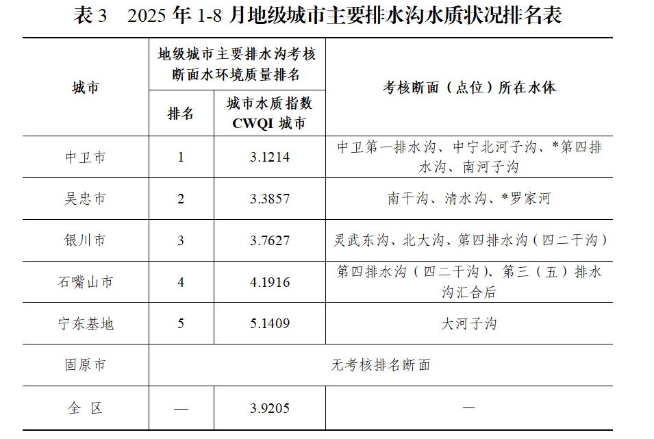 (一)地级城市主要排水沟考核断面水环境质量状况排名。2025年1-8月,按城市水质指数排名,地级城市(固原市无考核断面除外)及宁东基地主要排水沟水环境质量由好到差依次为:中卫市、吴忠市、银川市、石嘴山市、宁东基地。